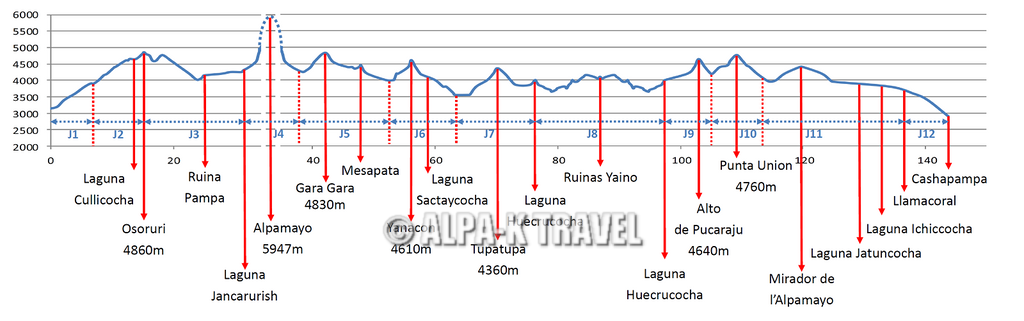 Jour 5: Nous reprendrons notre parcours sur le sentier du trekking du tour de l'Alapamyo, aujourd'hui nous marcherons 13 km. Nous monterons vers le premier col de la journée, le col de Gara Gara, durant cette ascension nous profiterons de la vue sur les sommets enneigés de l'Alpamayo, Quitaraju, Santa Cruz et sur la lagune Jancarurish. Nous atteindrons ensuite le Callejón de Huaylas et en traversant le col nous arriverons sur la vallée de Conchucos vers laquelle nous descendrons. Puis nous continuerons sur un chemin plus plat et monterons de nouveau vers le col de Mesapata d'où nous apprécierons la vue sur les lagunes Safunas. Nous redescendrons de nouveau pour atteindre une partie plate où nous établirons notre campement.